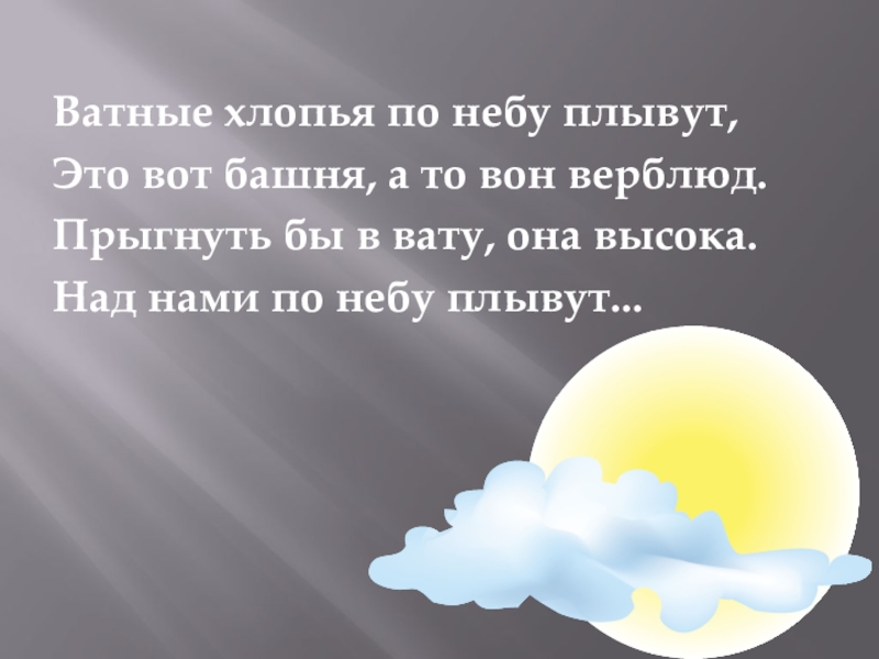 Ватные хлопья по небу плывут,Это вот башня, а то вон верблюд.Прыгнуть бы в вату, она высока.Над нами