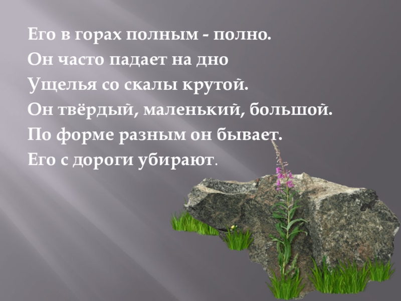Его в горах полным - полно.Он часто падает на дноУщелья со скалы крутой.Он твёрдый, маленький, большой.По форме