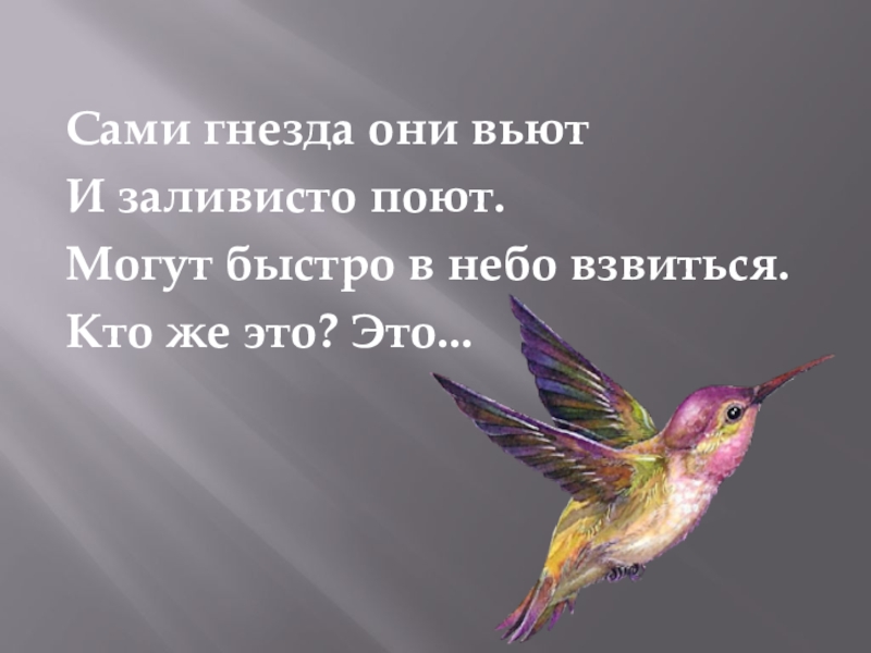 Сами гнезда они вьютИ заливисто поют.Могут быстро в небо взвиться.Кто же это? Это...
