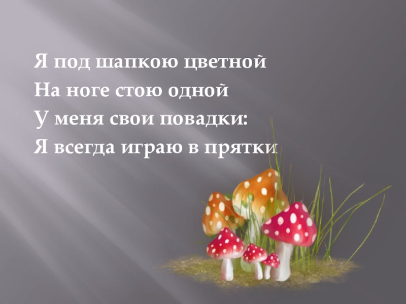 Я под шапкою цветнойНа ноге стою однойУ меня свои повадки:Я всегда играю в прятки