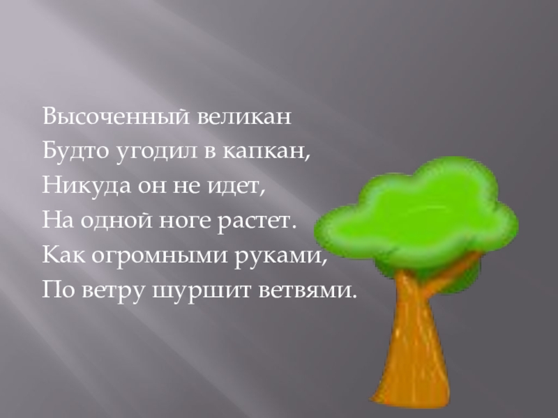 Высоченный великанБудто угодил в капкан,Никуда он не идет,На одной ноге растет.Как огромными руками,По ветру шуршит ветвями.