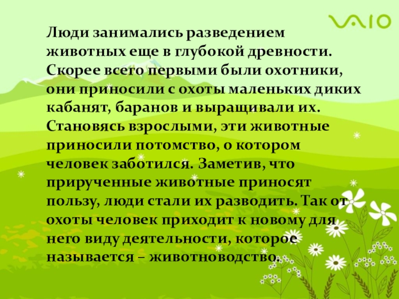 были охотники, они приносили с охоты маленьких диких кабанят, баранов и выращивали их. Становясь взрослыми, эти животные приносили потомство, о котором человек заботился. Заметив, что прирученные животные приносят пользу, люди стали их разводить. Так от охоты человек приходит к новому для него виду деятельности, которое называется – животноводство.