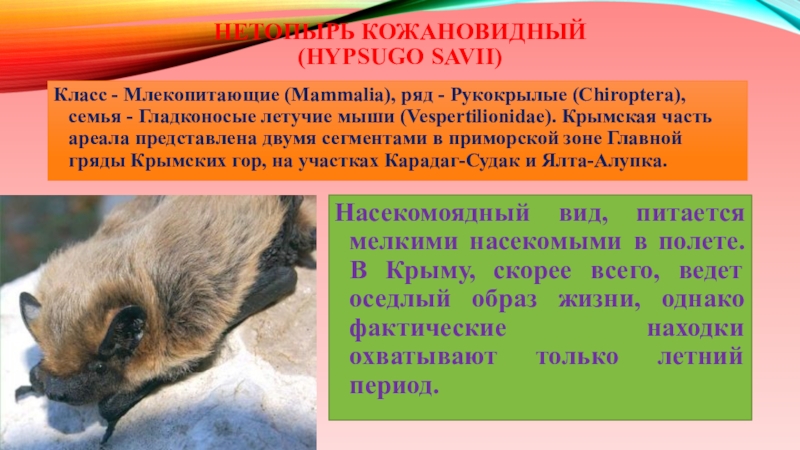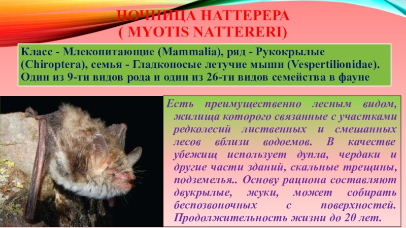 Слайд 14Класс - Млекопитающие (Mammalia), ряд - Рукокрылые (Chiroptera), семья - Гладконосые