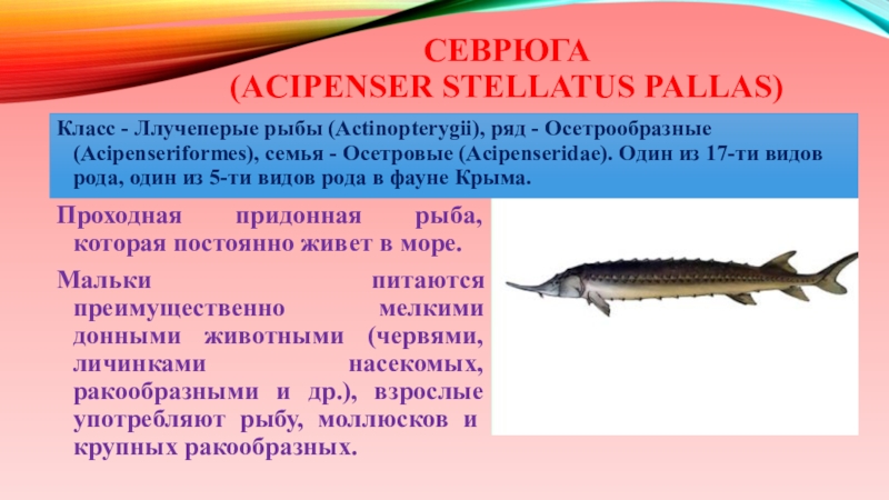 (Acipenseriformes), семья - Осетровые (Acipenseridae). Один из 17-ти видов рода, один из 5-ти видов рода в фауне Крыма.