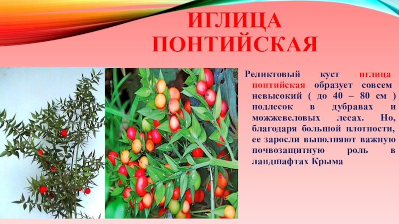 Красную книгу СССР. Всегда зеленые побеги и крупные красные ягоды иглицы придают ей прекрасный декоративный вид
