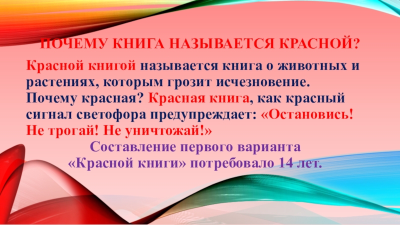 которым грозит исчезновение. Почему красная? Красная книга, как красный сигнал светофора предупреждает: «Остановись! Не трогай! Не уничтожай!»
