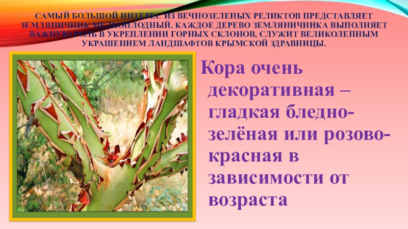 Слайд 35Самый большой интерес из вечнозеленых реликтов представляет земляничник мелкоплодный. Каждое дерево
