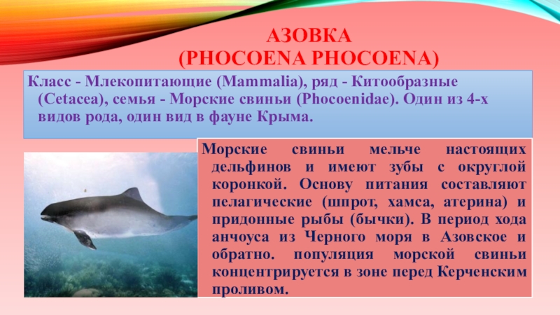 - Морские свиньи (Phocoenidae). Один из 4-х видов рода, один вид в фауне Крыма.