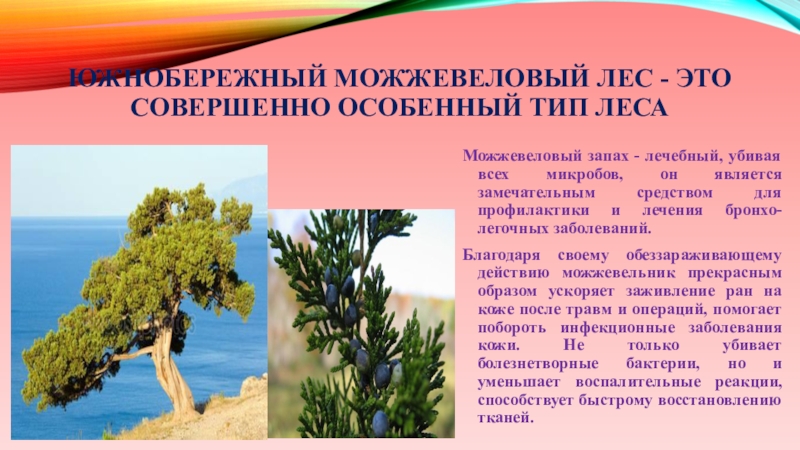 Слайд 37Южнобережный можжевеловый лес - это совершенно особенный тип леса