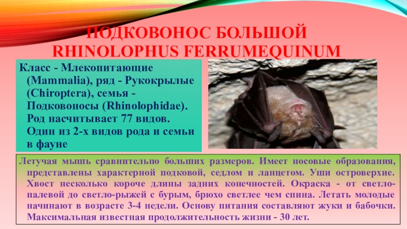 Слайд 15Летучая мышь сравнительно больших размеров. Имеет носовые образования, представлены характерной подковой,