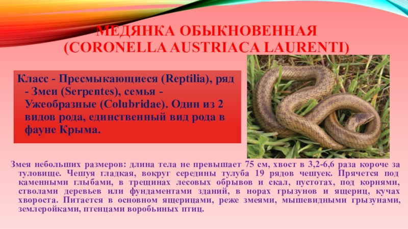 (Serpentes), семья - ужеобразные (Colubridae). Единственный представитель рода в фауне Крыма.