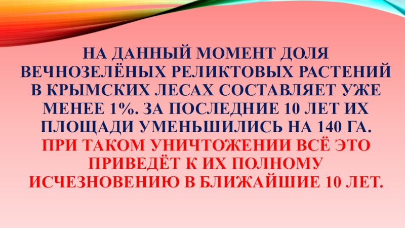 Слайд 33На данный момент доля вечнозелёных реликтовых растений в крымских лесах составляет