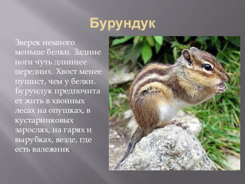 Бурундук Зверек немного меньше белки. Задние ноги чуть длиннее передних. Хвост менее пушист, чем у белки.Бурундук предпочитает жить