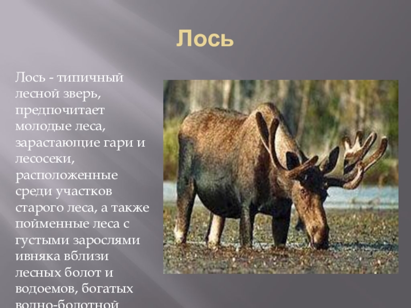 Лось Лось - типичный лесной зверь, предпочитает молодые леса, зарастающие гари и лесосеки, расположенные среди участков старого леса,