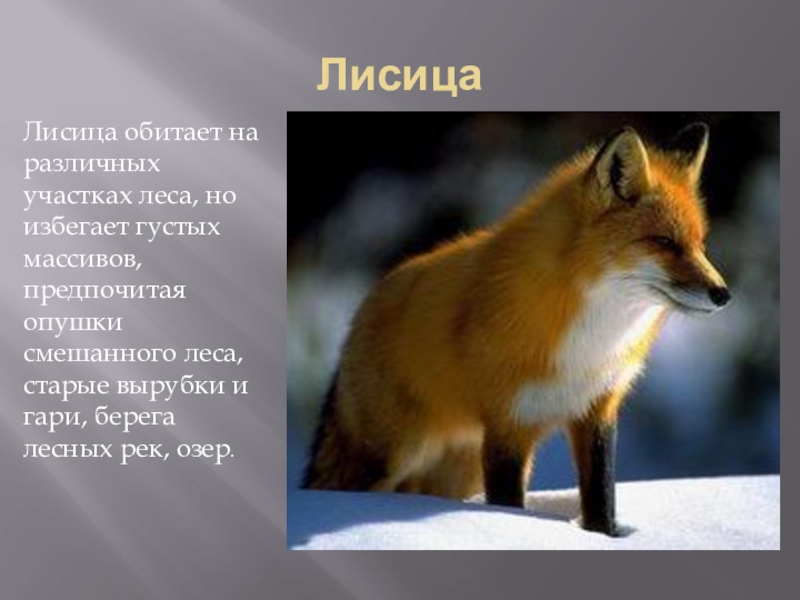 Лисица Лисица обитает на различных участках леса, но избегает густых массивов, предпочитая опушки смешанного леса, старые вырубки