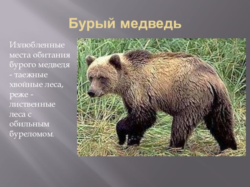 Бурый медведьИзлюбленные места обитания бурого медведя - таежные хвойные леса, реже - лиственные леса с обильным буреломом.