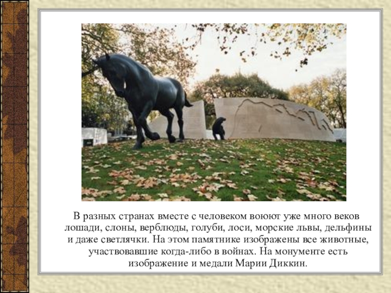 веков лошади, слоны, верблюды, голуби, лоси, морские львы, дельфины и даже светлячки. На этом памятнике изображены все животные, участвовавшие когда-либо в войнах. На монументе есть изображение и медали Марии Диккин.