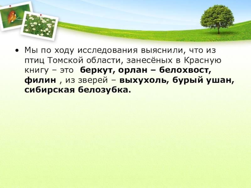 В результате проделанной работы мы узнали много интересного из жизни птиц и животных своего родного края, о Красной книге Томской области, стали полноправными читателями библиотеки, научились пользоваться словарями.