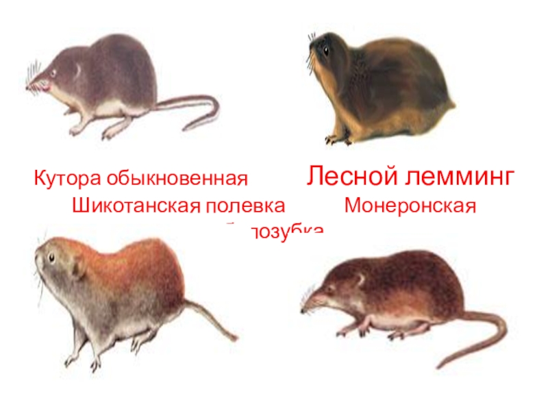 Слайд 20Кутора обыкновенная Лесной лемминг Шикотанская полевка