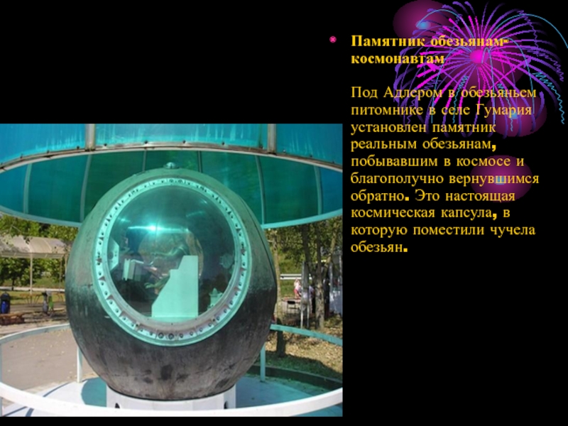 реальным обезьянам, побывавшим в космосе и благополучно вернувшимся обратно. Это настоящая космическая капсула, в которую поместили чучела обезьян.