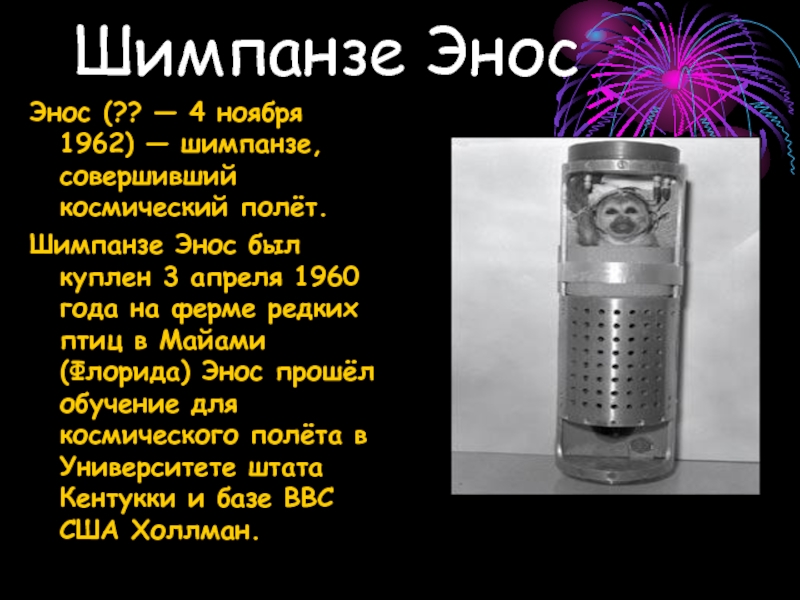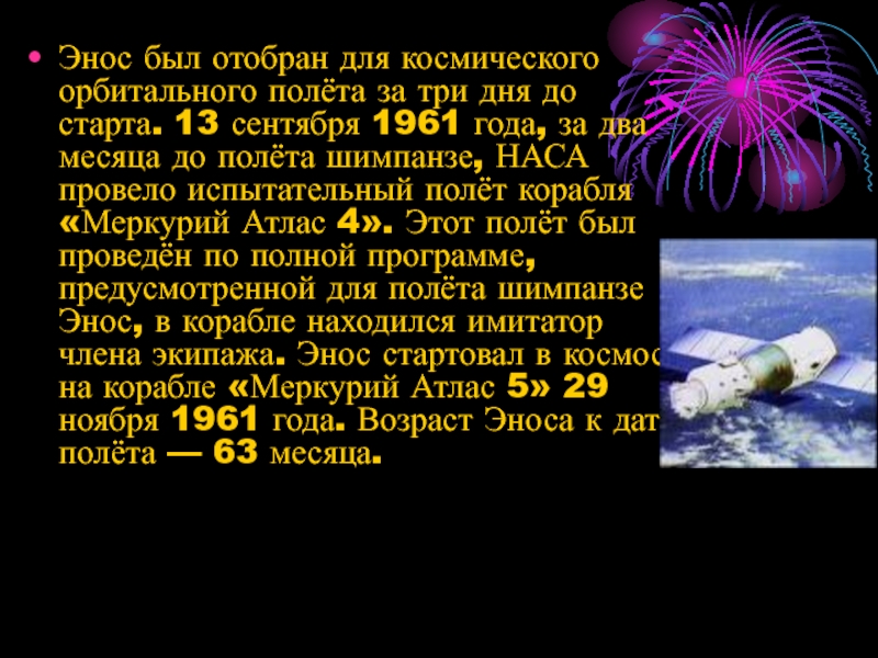 Слайд 24Энос был отобран для космического орбитального полёта за три дня до
