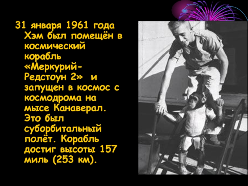Слайд 1831 января 1961 года Хэм был помещён в космический корабль «Меркурий-Редстоун