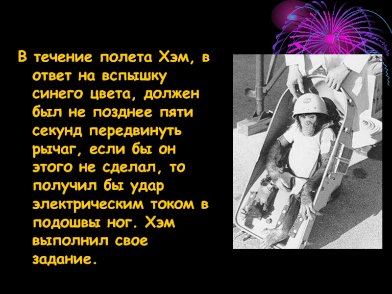 Слайд 20В течение полета Хэм, в ответ на вспышку синего цвета, должен