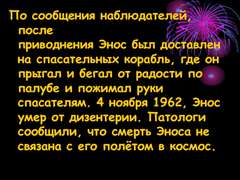 приводнения Энос был доставлен на спасательных корабль, где он прыгал и бегал от радости по палубе и пожимал руки спасателям. 4 ноября 1962, Энос умер от дизентерии. Патологи сообщили, что смерть Эноса не связана с его полётом в космос.