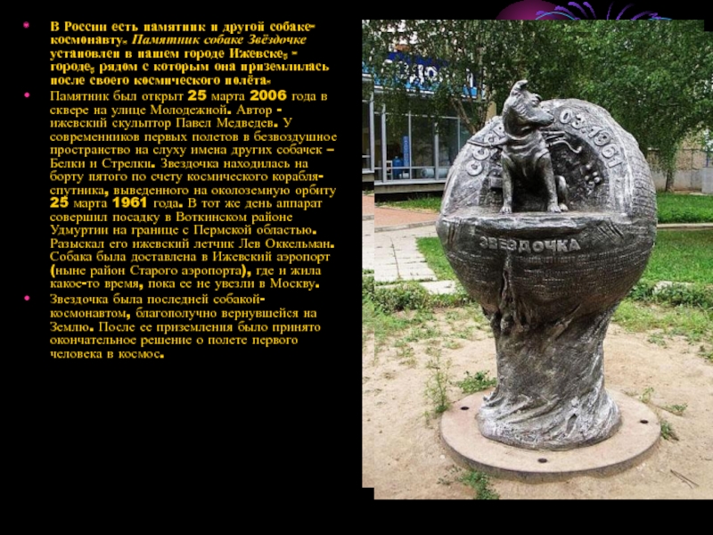 Слайд 15В России есть памятник и другой собаке-космонавту. Памятник собаке Звёздочке установлен