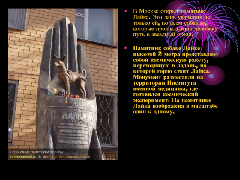Памятник собаке Лайке высотой 2 метра представляет собой космическую ракету, переходящую в ладонь, на которой гордо стоит Лайка. Монумент разместили на территории Института военной медицины, где готовился космический эксперимент. На памятнике Лайка изображена в масштабе один к одному.