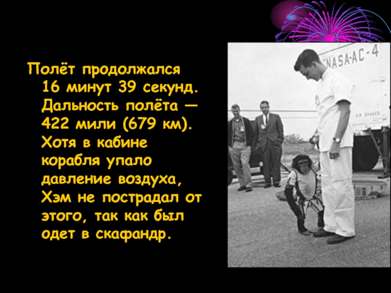(679 км). Хотя в кабине корабля упало давление воздуха, Хэм не пострадал от этого, так как был одет в скафандр.