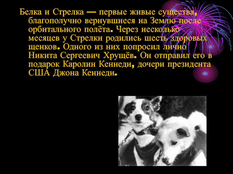 после орбитального полёта. Через несколько месяцев у Стрелки родились шесть здоровых щенков. Одного из них попросил лично Никита Сергеевич Хрущёв. Он отправил его в подарок Каролин Кеннеди, дочери президента США Джона Кеннеди.