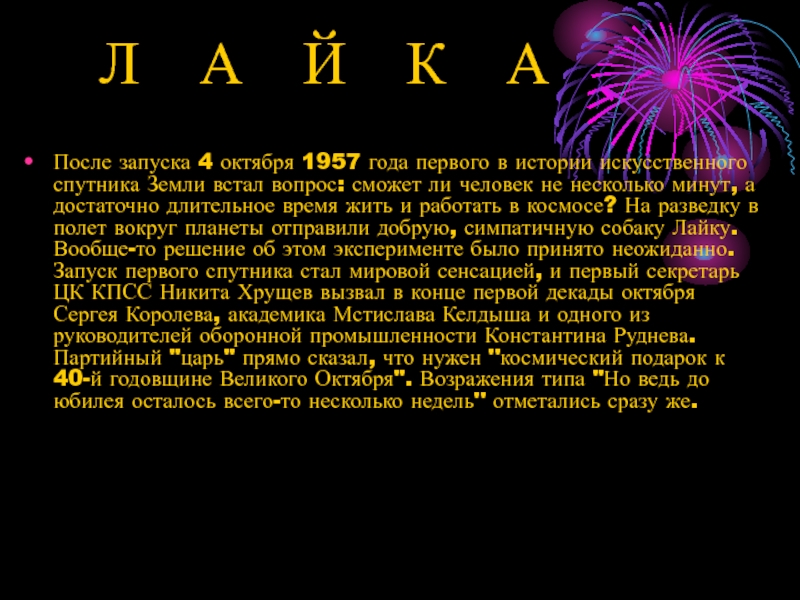 Земли встал вопрос: сможет ли человек не несколько минут, а достаточно длительное время жить и работать в космосе? На разведку в полет вокруг планеты отправили добрую, симпатичную собаку Лайку. Вообще-то решение об этом эксперименте было принято неожиданно. Запуск первого спутника стал мировой сенсацией, и первый секретарь ЦК КПСС Никита Хрущев вызвал в конце первой декады октября Сергея Королева, академика Мстислава Келдыша и одного из руководителей оборонной промышленности Константина Руднева. Партийный "царь" прямо сказал, что нужен "космический подарок к 40-й годовщине Великого Октября". Возражения типа "Но ведь до юбилея осталось всего-то несколько недель" отметались сразу же.