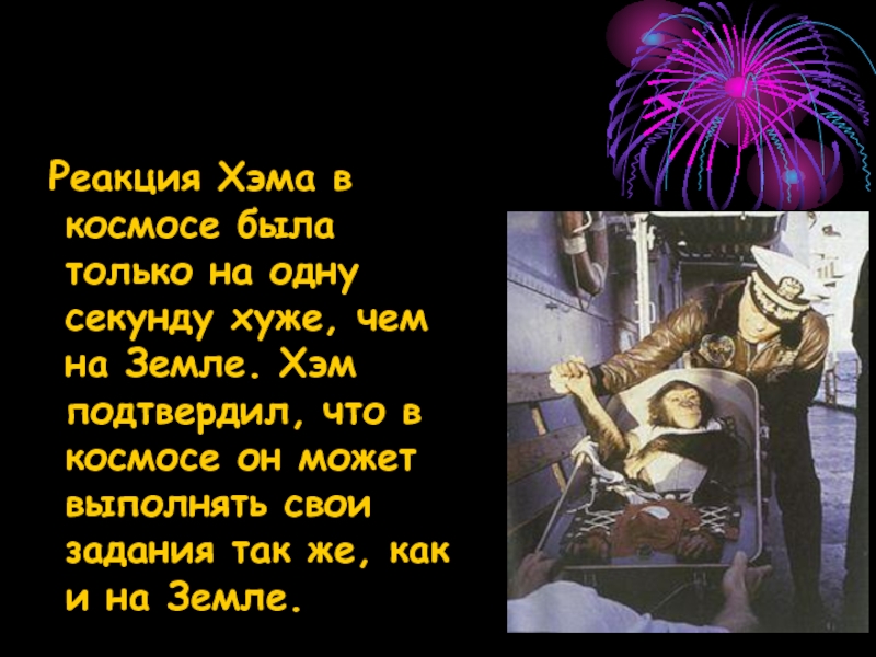 чем на Земле. Хэм подтвердил, что в космосе он может выполнять свои задания так же, как и на Земле.