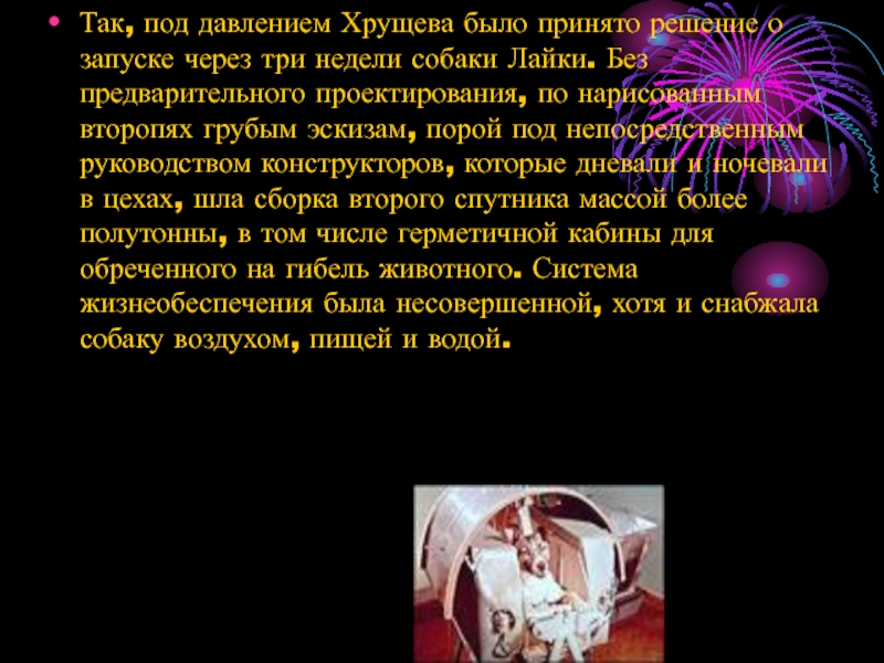 недели собаки Лайки. Без предварительного проектирования, по нарисованным второпях грубым эскизам, порой под непосредственным руководством конструкторов, которые дневали и ночевали в цехах, шла сборка второго спутника массой более полутонны, в том числе герметичной кабины для обреченного на гибель животного. Система жизнеобеспечения была несовершенной, хотя и снабжала собаку воздухом, пищей и водой.