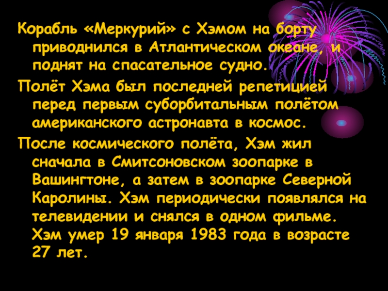 Слайд 22Корабль «Меркурий» с Хэмом на борту приводнился в Атлантическом океане, и