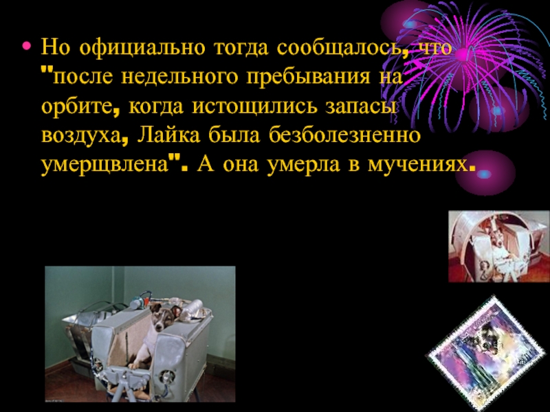 истощились запасы воздуха, Лайка была безболезненно умерщвлена". А она умерла в мучениях.