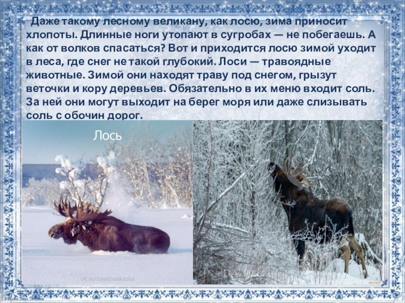 Слайд 25 Даже такому лесному великану, как лосю, зима приносит хлопоты. Длинные