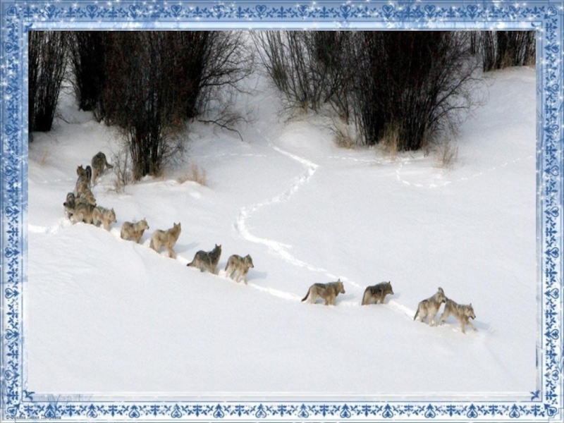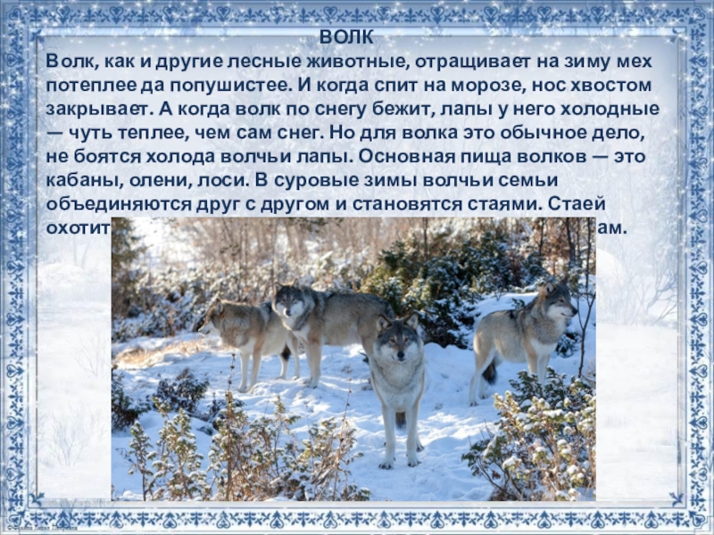 Волк, как и другие лесные животные, отращивает на зиму мех потеплее да попушистее. И когда спит на морозе, нос хвостом закрывает. А когда волк по снегу бежит, лапы у него холодные — чуть теплее, чем сам снег. Но для волка это обычное дело, не боятся холода волчьи лапы. Основная пища волков — это кабаны, олени, лоси. В суровые зимы волчьи семьи объединяются друг с другом и становятся стаями. Стаей охотиться легче, чем в одиночку. Охотятся волки по ночам.