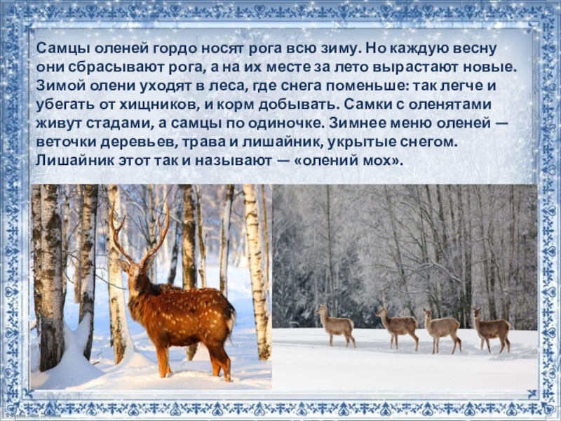 сбрасывают рога, а на их месте за лето вырастают новые. Зимой олени уходят в леса, где снега поменьше: так легче и убегать от хищников, и корм добывать. Самки с оленятами живут стадами, а самцы по одиночке. Зимнее меню оленей — веточки деревьев, трава и лишайник, укрытые снегом. Лишайник этот так и называют — «олений мох».