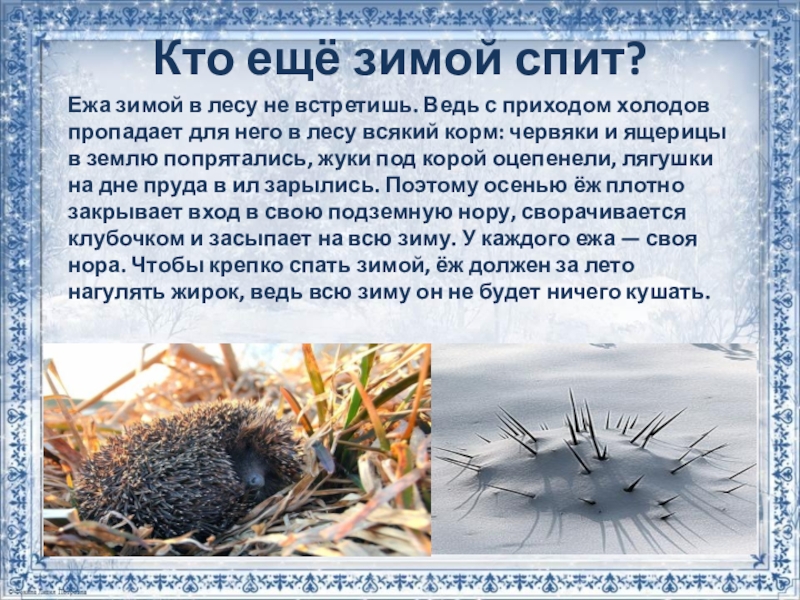 приходом холодов пропадает для него в лесу всякий корм: червяки и ящерицы в землю попрятались, жуки под корой оцепенели, лягушки на дне пруда в ил зарылись. Поэтому осенью ёж плотно закрывает вход в свою подземную нору, сворачивается клубочком и засыпает на всю зиму. У каждого ежа — своя нора. Чтобы крепко спать зимой, ёж должен за лето нагулять жирок, ведь всю зиму он не будет ничего кушать.