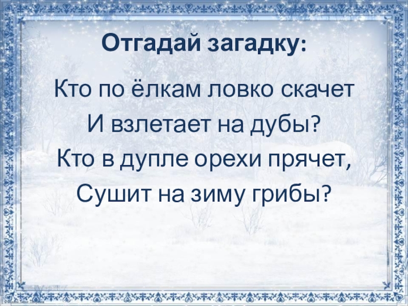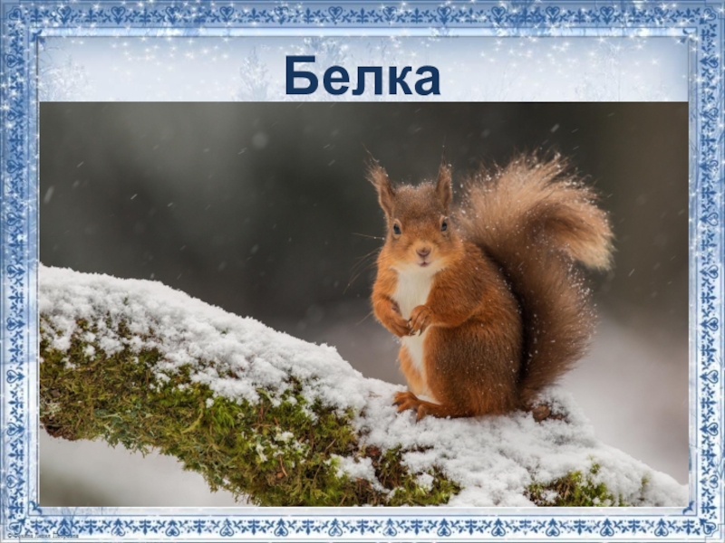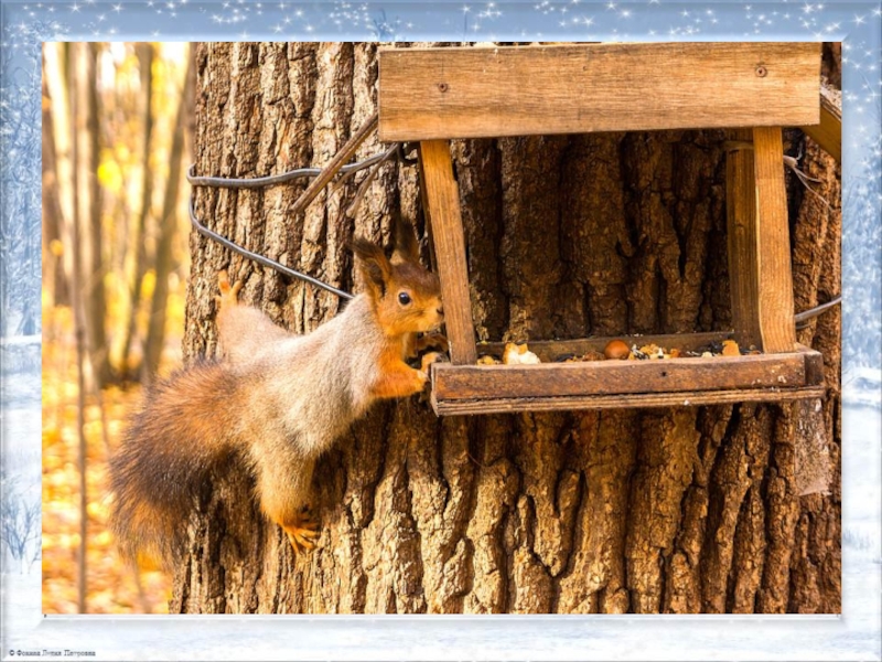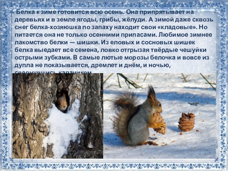 Слайд 14 Белка к зиме готовится всю осень. Она припрятывает на деревьях