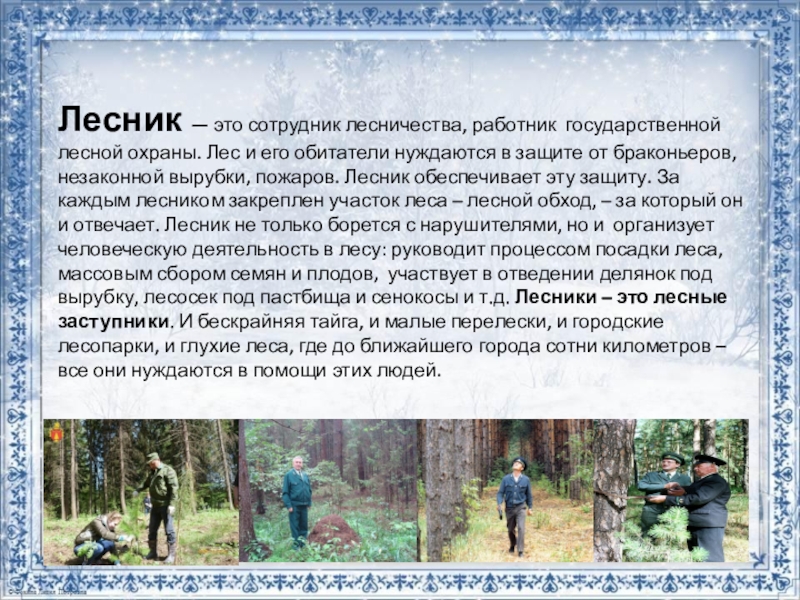 нуждаются в защите от браконьеров, незаконной вырубки, пожаров. Лесник обеспечивает эту защиту. За каждым лесником закреплен участок леса – лесной обход, – за который он и отвечает. Лесник не только борется с нарушителями, но и организует человеческую деятельность в лесу: руководит процессом посадки леса, массовым сбором семян и плодов, участвует в отведении делянок под вырубку, лесосек под пастбища и сенокосы и т.д. Лесники – это лесные заступники. И бескрайняя тайга, и малые перелески, и городские лесопарки, и глухие леса, где до ближайшего города сотни километров – все они нуждаются в помощи этих людей.
