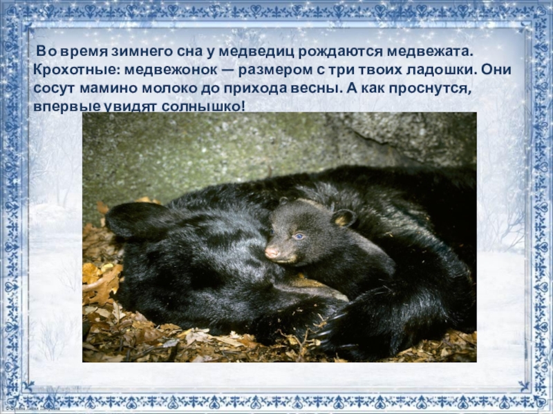 — размером с три твоих ладошки. Они сосут мамино молоко до прихода весны. А как проснутся, впервые увидят солнышко!
