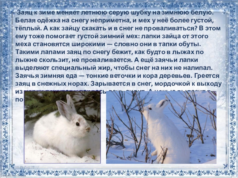 Слайд 10 Заяц к зиме меняет летнюю серую шубку на зимнюю белую.
