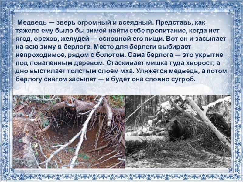 было бы зимой найти себе пропитание, когда нет ягод, орехов, желудей — основной его пищи. Вот он и засыпает на всю зиму в берлоге. Место для берлоги выбирает непроходимое, рядом с болотом. Сама берлога — это укрытие под поваленным деревом. Стаскивает мишка туда хворост, а дно выстилает толстым слоем мха. Уляжется медведь, а потом берлогу снегом засыпет — и будет она словно сугроб.