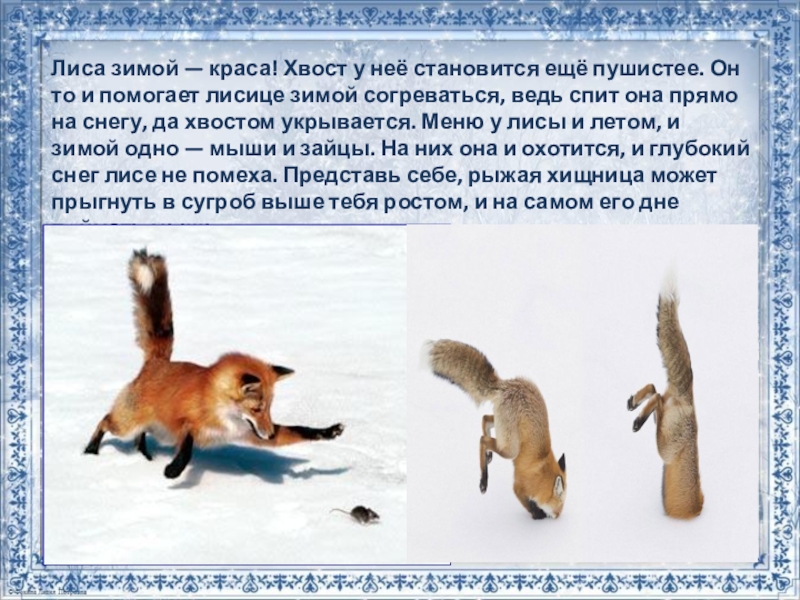 Лиса зимой — краса! Хвост у неё становится ещё пушистее. Он то и помогает лисице зимой согреваться, ведь спит она прямо на снегу, да хвостом укрывается. Меню у лисы и летом, и зимой одно — мыши и зайцы. На них она и охотится, и глубокий снег лисе не помеха. Представь себе, рыжая хищница может прыгнуть в сугроб выше тебя ростом, и на самом его дне поймать мышь.
