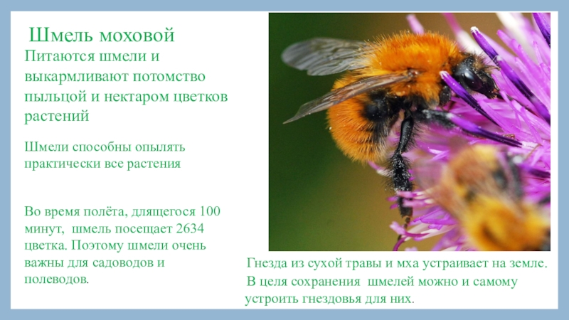 Во время полёта, длящегося 100 минут, шмель посещает 2634 цветка. Поэтому шмели очень важны для садоводов и полеводов.