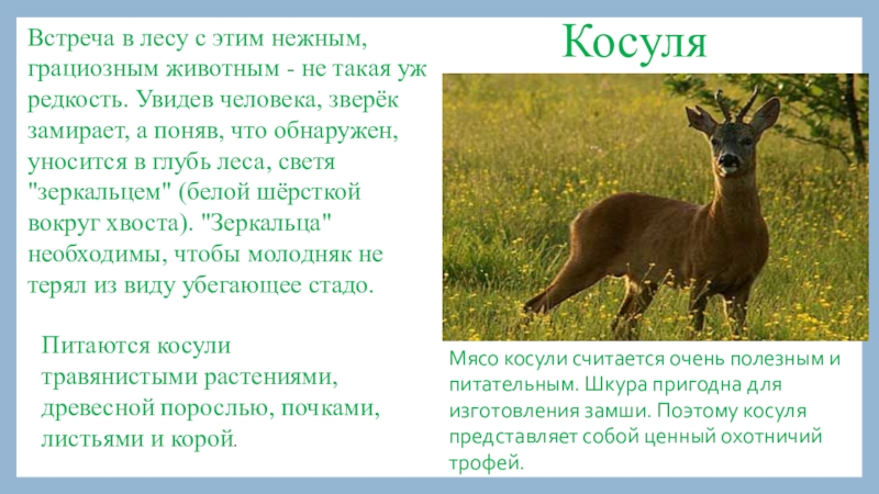 Питаются косули травянистыми растениями, древесной порослью, почками, листьями и корой.