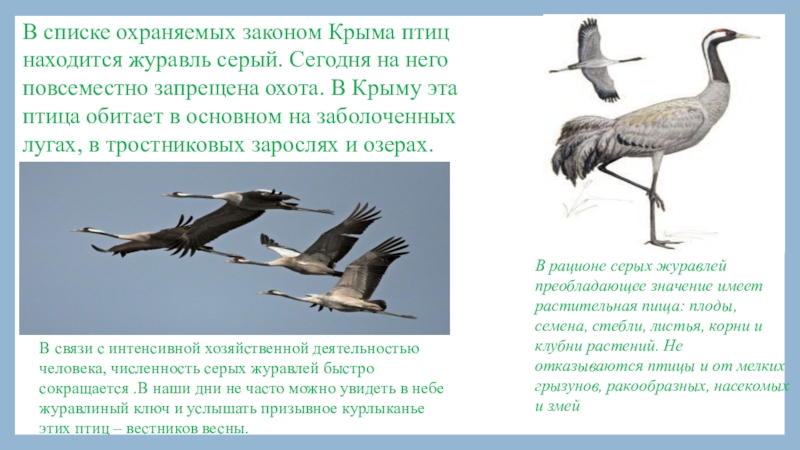 В связи с интенсивной хозяйственной деятельностью человека, численность серых журавлей быстро сокращается .В наши дни не часто можно увидеть в небе журавлиный ключ и услышать призывное курлыканье этих птиц – вестников весны.